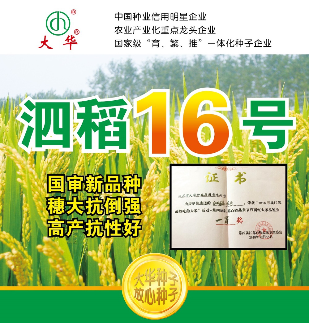 大華種業(yè)現(xiàn)階段主營常規(guī)稻麥種子,同時(shí)大力發(fā)展雜交玉米、雜交水稻種子經(jīng)營。公司現(xiàn)有“大華牌”水稻種子、小麥種子、大麥種子3個(gè)“江蘇省名牌產(chǎn)品”,2012年“大華”商標(biāo)被國家商標(biāo)局認(rèn)定為“中國馳名商標(biāo)”。當(dāng)前,公司在營各類農(nóng)作物品種40多個(gè),其中,常規(guī)水稻主推華粳5號(hào)、華粳9號(hào)、連粳13、揚(yáng)農(nóng)香28、泗稻16、大華香糯、連糯1號(hào)等高產(chǎn)優(yōu)質(zhì)品種;小麥主推華麥5號(hào)、華麥8號(hào)、華麥1028、鎮(zhèn)麥168、鎮(zhèn)麥10號(hào)、揚(yáng)麥29、揚(yáng)輻麥10號(hào)、鄭麥1860等高產(chǎn)優(yōu)質(zhì)品種;玉米主推蘇玉34、大華1146、蘇玉糯602等品種。