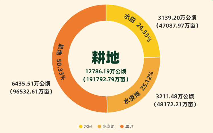 《公報》顯示:我國耕地19.18億畝,其中水田4.71億畝,占24.55%;水澆地4.81億畝,占25.12%;旱地9.65億畝,占50.33%64%的耕地分布在秦嶺—淮河以北。黑龍江、內(nèi)蒙古、河南、吉林、新疆等五個省份耕地面積較大,占全國耕地的40%。位于一年三熟制地區(qū)的耕地2.82億畝,占全國耕地的14.73%;位于一年兩熟制地區(qū)的耕地7.17億畝,占37.40%;位于一年一熟制地區(qū)的耕地9.18億畝,占47.87%