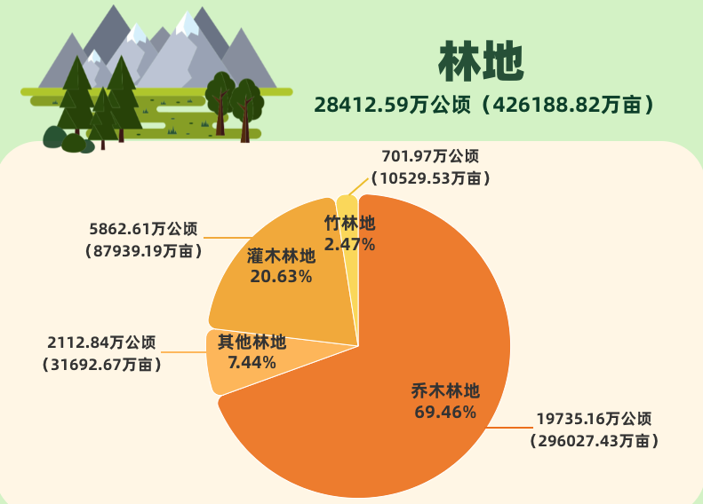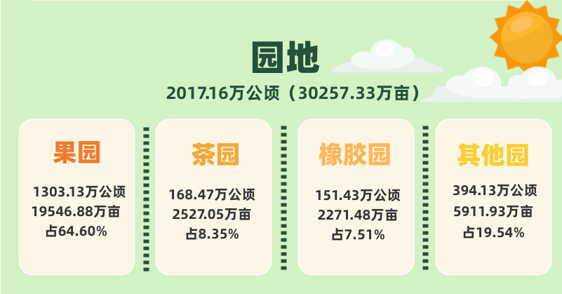《公報》還顯示:我國園地面積3.03億畝。其中果園1.95億畝,占64.60%;茶園0.25億畝,占8.35%。草地39.68億畝。其中天然牧草地31.98億畝,占80.59%;人工牧草地0.09億畝,占0.22%。林地42.62億畝。濕地3.52億畝。城鎮(zhèn)村及工礦用地5.3億畝。其中村莊用地3.29億畝,占62.13%。交通運(yùn)輸用地1.43億畝。其中農(nóng)村道路0.71億畝,占49.88%。水域及水利設(shè)施用地5.44億畝。其中水庫水面0.51億畝,占9.28%;坑塘水面0.96億畝,占17.69%;溝渠0.53億畝,占9.69%