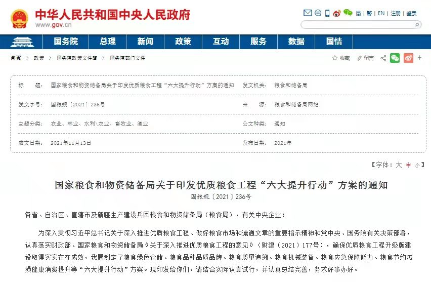 ——《糧食品種品質(zhì)品牌提升行動(dòng)方案》:持續(xù)開(kāi)展“中國(guó)好糧油”行動(dòng),聚焦增加綠色優(yōu)質(zhì)糧油產(chǎn)品供給,著力優(yōu)化糧食供給結(jié)構(gòu),促進(jìn)糧油品質(zhì)提升,打造優(yōu)質(zhì)糧食品牌,搞活糧食市場(chǎng)和流通,加快糧食產(chǎn)業(yè)創(chuàng)新發(fā)展、轉(zhuǎn)型升級(jí)、提質(zhì)增效。到2025年,優(yōu)質(zhì)糧食供給更加豐富,糧食品質(zhì)明顯提升,糧食品牌體系更加完善,糧油品牌和營(yíng)銷(xiāo)市場(chǎng)競(jìng)爭(zhēng)力持續(xù)提升。充分融合“好糧油”銷(xiāo)售示范點(diǎn)、糧食應(yīng)急供應(yīng)網(wǎng)點(diǎn)、軍糧供應(yīng)網(wǎng)點(diǎn)和主食廚房等,健全線上線下?tīng)I(yíng)銷(xiāo)體系,加快由“吃得飽”向“吃得好”“吃得營(yíng)養(yǎng)健康”轉(zhuǎn)變。