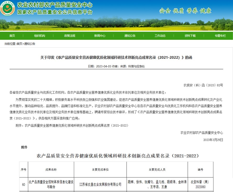 •        2023年4月3日,蘇墾農(nóng)發(fā)“農(nóng)產(chǎn)品質(zhì)量安全控制體系信息化建設與融合”創(chuàng)新成果成功入選農(nóng)業(yè)農(nóng)村部《農(nóng)產(chǎn)品質(zhì)量安全營養(yǎng)健康優(yōu)質(zhì)化領域科研技術(shù)創(chuàng)新亮點成果名錄(2021-2022)》。據(jù)悉,該目錄每2年評審一次,全國63個成果、江蘇省3個成果入選,蘇墾農(nóng)發(fā)首次入選該名錄,是省內(nèi)唯一一個入圍的企業(yè)單位。