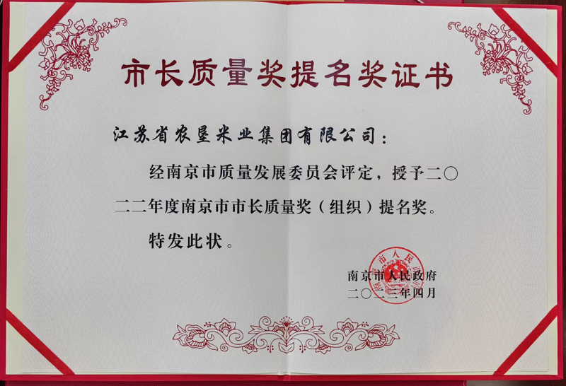 • 6月2日,2022年度南京市市長質量獎名單正式揭曉,蘇墾米業榮獲2022年度南京市市長質量獎(組織)提名獎。