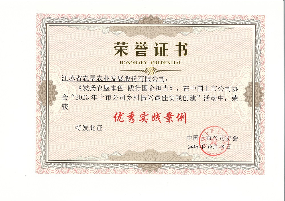 • 近日,蘇墾農發連獲“2023年公司治理最佳實踐案例”和“2023年上市公司鄉村振興最佳實踐創建優秀實踐案例”兩項榮譽,體現了蘇墾農發在公司治理、助力鄉村振興等方面的工作得到了社會的高度認可。