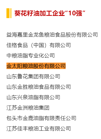 喜報!2024年食用油加工企業“50強”、“10強”公示名單,金太陽糧油入選榜單!