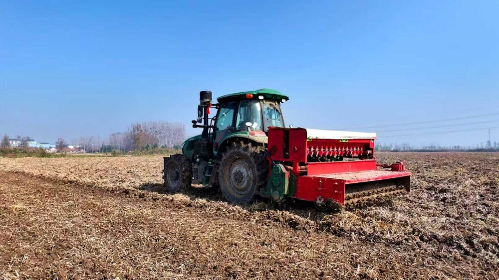 精細化管理是今年秋播工作的又一亮點。各外拓基地根據當地實際情況,制定了詳細的秋播技術方案和田間管理預案?;剞k全體人員分區包干,駐點跟蹤服務,對整地質量、播種深度、密度和施肥量等進行專項督查指導,做到“一區一策”,實現精準化管理。同時,加強土壤墑情監測,密切關注天氣變化,及時做好抗旱防澇準備,確保秋播小麥在最佳環境下生長。此外,充分發揮現代農業機械化優勢,外聯大批先進、智能的農業機械參與秋播作業。根據今年土壤墑情,選擇小履帶拖拉機進行開溝作業,安裝了北斗導航系統的智能化播種機實現直線播種、播深一致,不僅大幅提升了作業效率和質量,也為后續的田間管理和機械化收獲創造了有利條件。